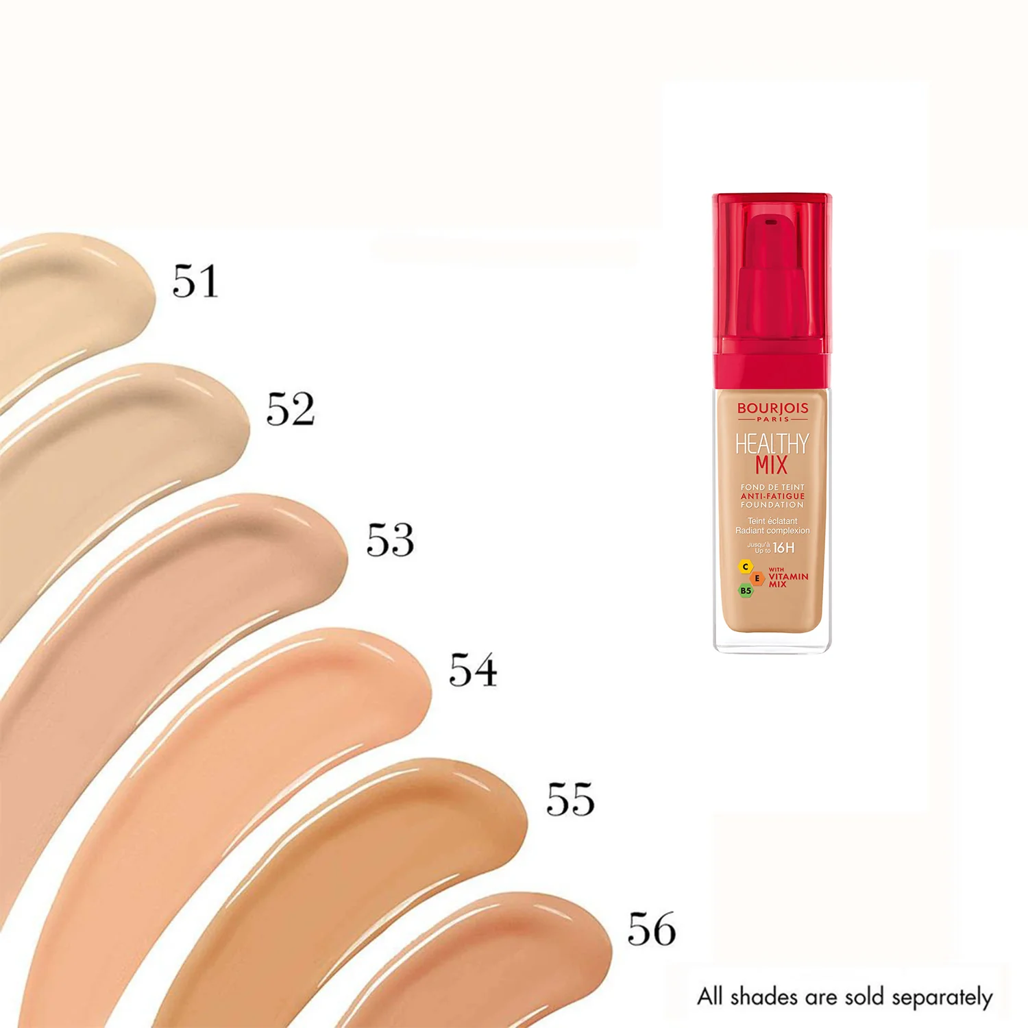 رنگبندی 51 (Light Vanilla)، 52 (Vanilla)، 53 (Light Beige)، 54 (Beige)، 55 (Dark Beige) و 56 (Light Bronze) تنوعی گسترده برای تناژهای پوستی مختلف ارائه میدهد.