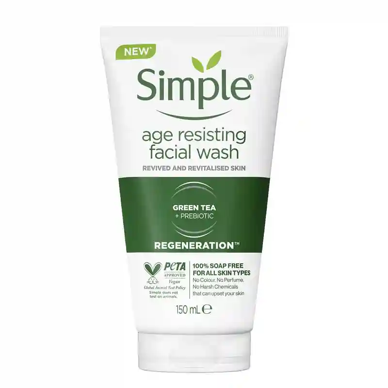 ژل شستشو ضد پیری سیمپل مدل AGE RESISTING با حجم 150 میلی لیتر، محصولی از برند Simple (تولید انگلستان یا مجارستان تحت لیسانس انگلستان)، یک شوینده ملایم با خواص ضد پیری است که با فرمولاسیون حاوی پروویتامین B5، ویتامین E، عصاره چای سبز، بابونه، جو دوسر بتا گلوکان و عصاره قارچ، پوست را از آلودگی، چربی و آرایش پاک کرده، به کاهش علائم پیری مانند چروک و افتادگی کمک می‌کند و رطوبت‌رسانی عمیق ارائه می‌دهد. این شوینده فاقد صابون، الکل، عطر، رنگ مصنوعی، پارابن و مواد شیمیایی خشن، مناسب انواع پوست به‌ویژه پوست‌های حساس و بالغ، غیرکومدون‌زا، وگان و بدون تست حیوانی است. برند سیمپل از سال 1960 با محصولات ملایم و دوستدار پوست و محیط زیست، در جهان شناخته شده است.