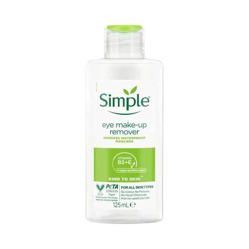 پاک کننده آرایش چشم سیمپل مدل Simple Eye Makeup Remover (Simple Kind to Skin Eye Make-up Remover) محصولی ملایم و مؤثر از برند انگلیسی سیمپل است که برای پاکسازی آرایش چشم، حتی آرایشهای ضدآب، طراحی شده است. این محصول با حجم 125 میلیلیتر، حاوی پروویتامین B5، ویتامین E و آب تصفیهشده سهگانه، پوست حساس دور چشم را آبرسانی کرده و بدون ایجاد سوزش یا خشکی، آرایش را بهطور کامل پاک میکند. فاقد الکل، پارابن، عطر، رنگ مصنوعی و مواد شیمیایی خشن، این پاک کننده وگان، غیرکومدونزا و مناسب برای پوستهای حساس و استفادهکنندگان لنز تماسی است.