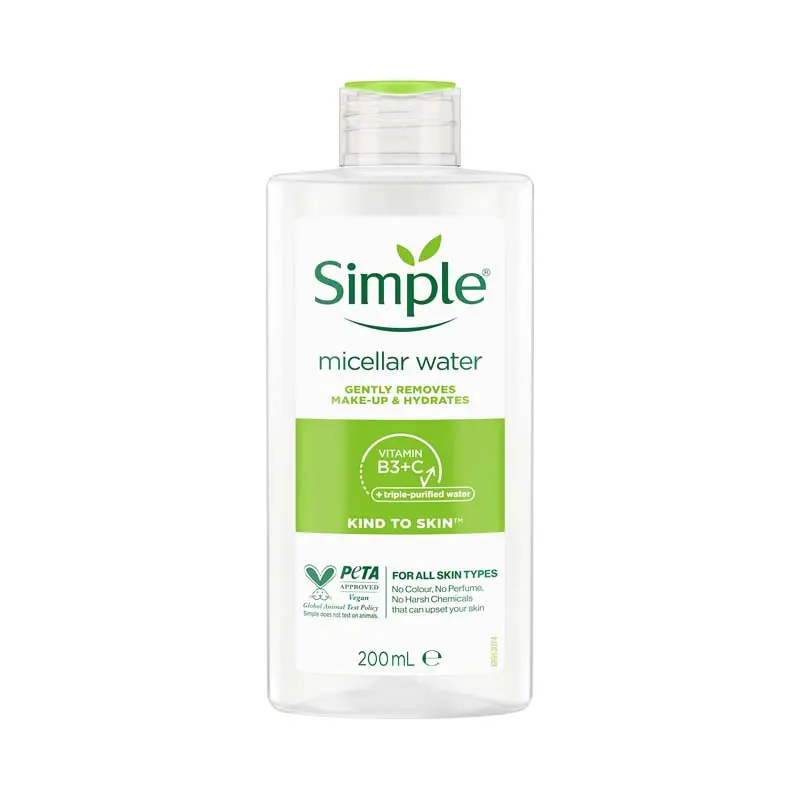 میسلار واتر آرایش صورت سیمپل مدل Gently Removes (Simple Kind to Skin Micellar Cleansing Water) محصولی ملایم و مؤثر از برند انگلیسی سیمپل است که برای پاکسازی آرایش، آلودگیها و چربیهای اضافی از پوست طراحی شده است. این محصول با حجم 200 میلیلیتر، حاوی ویتامینهای B3 و C و آب تصفیهشده سهگانه، پوست را تا 90% آبرسانی کرده و بدون ایجاد خشکی یا تحریک، برای انواع پوست، بهویژه پوستهای حساس، مناسب است. فاقد الکل، پارابن، عطر، رنگ مصنوعی و مواد شیمیایی خشن، این میسلار واتر وگان و بدون تست حیوانی بوده و توسط متخصصان پوست و چشم تأیید شده است.
